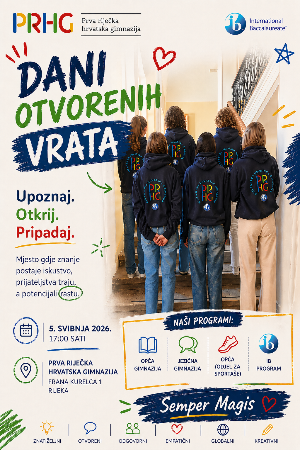 Dođite vidjeti kako izgleda naša škola iznutra, upoznajte profesore i učenike te saznajte sve što vas zanima o programima, nastavi i životu u školi. Bez brige – nema dosadnih govora, pripremili smo zanimljive aktivnosti, radionice i opuštenu atmosferu.