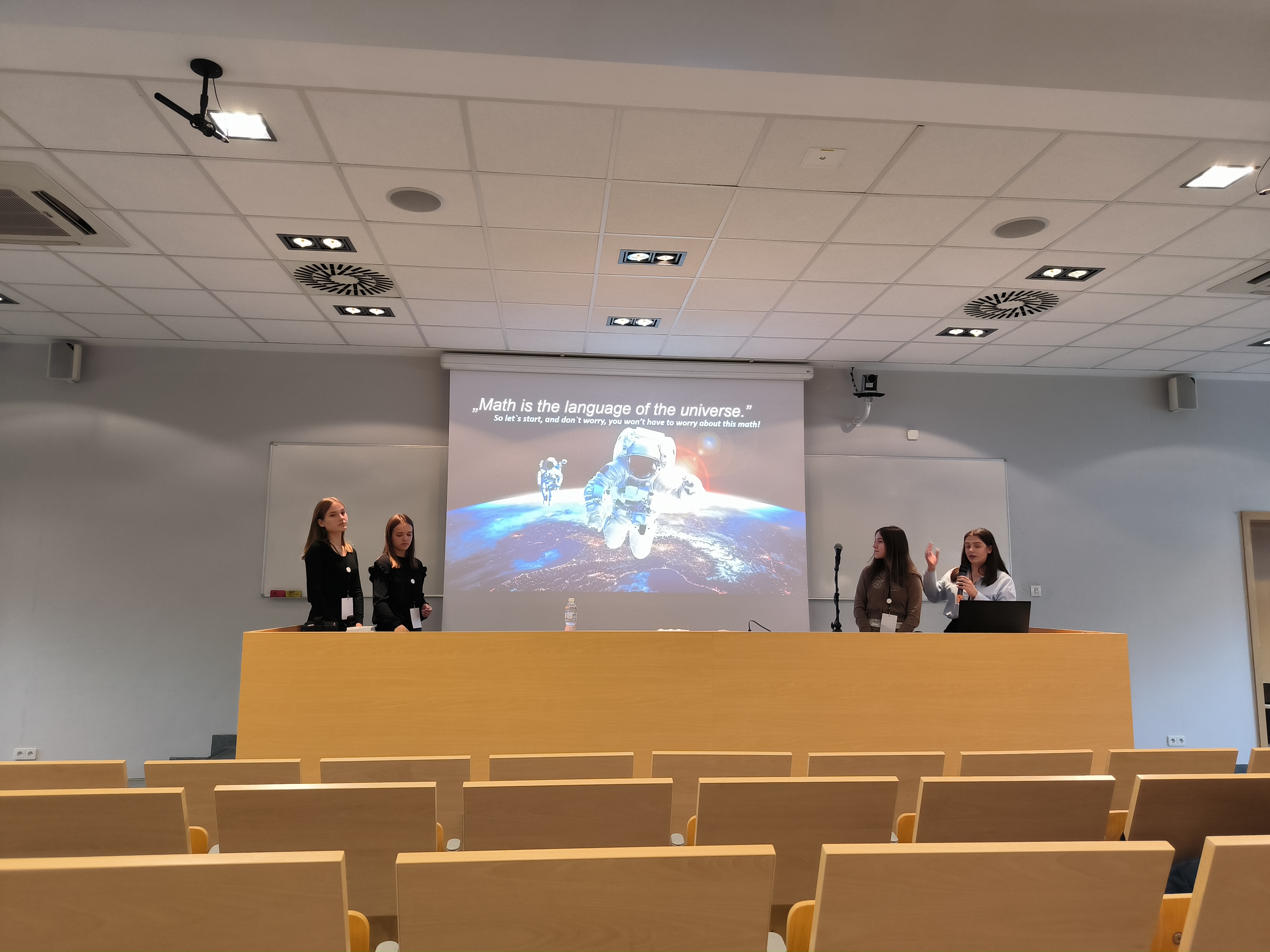 Učenice 2.b razreda Zrinka Miškić, Lana Vučetić, Petra Bušljeta i Nika Tomljanović u pratnji nastavnice matematike Danijele Mohorić, sudjeluju na Euromath konferenciji u Krakowu, Poljska, od 13. do 15. ožujka. Predstavile su i svoju prezentaciju The universe in a calculator.