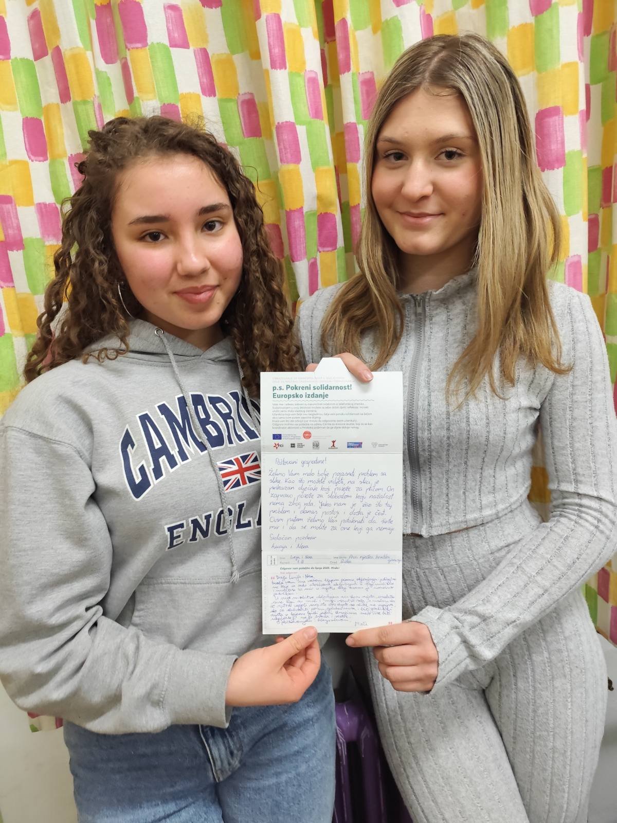 Počevši od Međunarodnog dana eliminacije rasne diskriminacije koji se obilježava 21. ožujka poslali smo poruke našim sugrađanima, ali i javnim osobama, ukazujući im na probleme diskriminacije, neravnopravnosti, mentalnog zdravlja, ratnih sukoba, siromaštva, odnosa prema okolišu ilustrirane fotografijama na razglednicama. Uskoro su stigli odgovori koje možete pročitati na panou pored zbornice. Župan je odgovorio pozivom učenicima i učenicama 1.b razreda i prof. Heleni de Karina u ured Županije gdje ih je primila Ermina Duraj, pročelnica Upravnog odjela za poslove župana i Županijske skupštine.