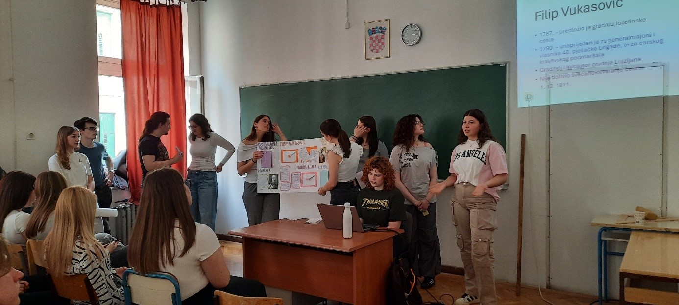 Ove školske godine učenici 3.a, 3.b i 3.d razreda naše škole na nastavi povijesti i geografije bavili su se istraživanjem prvih modernih cesta i željeznicom kojima su povezani Rijeka i Karlovac. Svaki razred istraživao je uzroke i okolnosti gradnje prometnica, ključne ličnosti vezane uz gradnju prometnica, posljedice gradnje proučavanih cesta i željeznice s naglaskom na razvoj Rijeke i Karlovca, ali i manjih naselja uz Karolinsku cestu. Lujzinsku cestu i željezničku prugu. Učenici 3.a razreda proučavali su povijest Karolinske ceste, učenici 3.b izgradnju željezničke pruge između Rijeke i Karlovca, a učenici 3.d razreda Lujzinsku cestu. Istim zadacima bavila su se i tri treća razreda Gimnazije Karlovac.