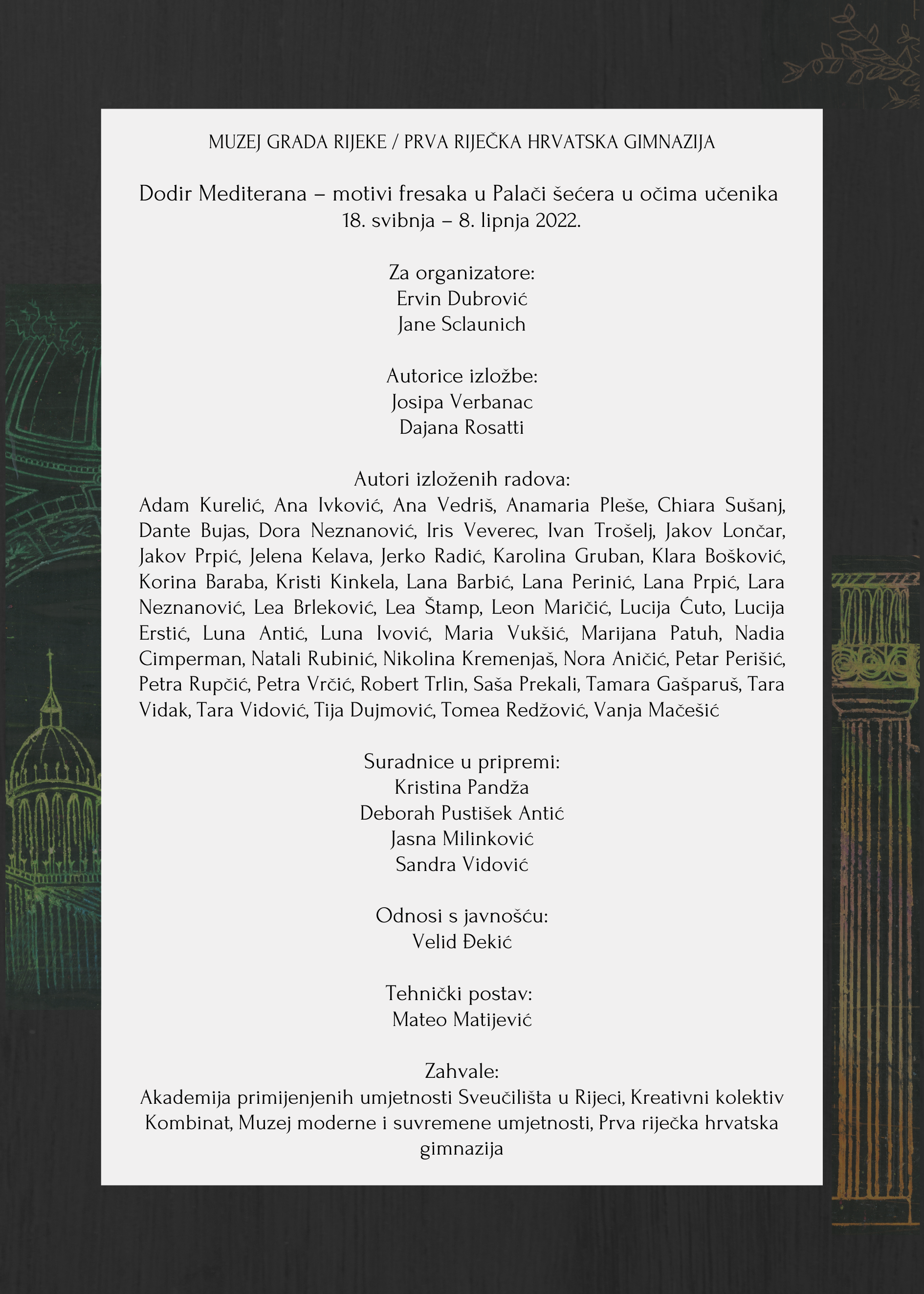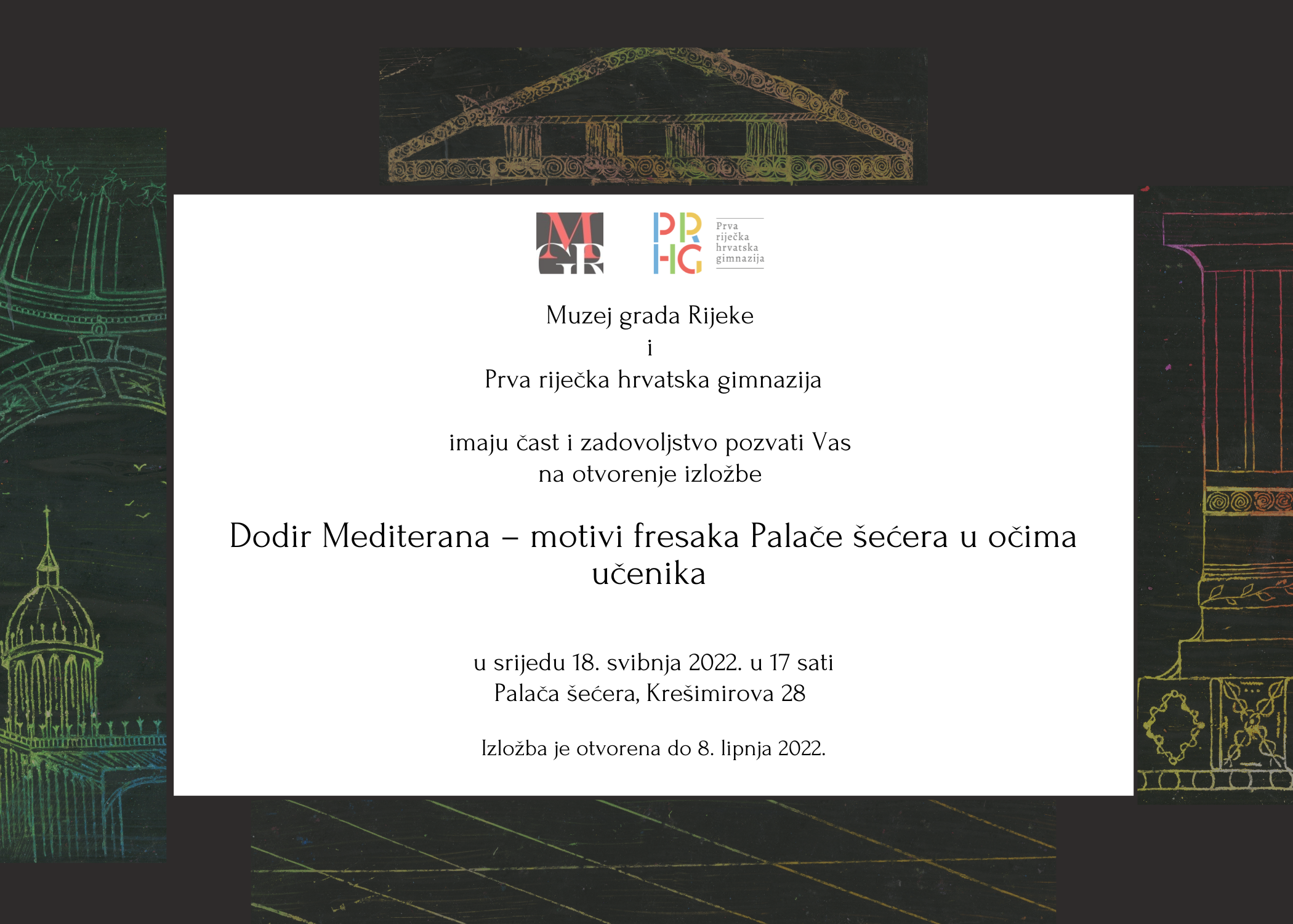 U srijedu, 18.5.2022. godine u Palači šećera biti će otvorena izložba likovnih radova učenika Prve riječke hrvatske gimnazije pod nazivom „Dodir Mediterana – motivi fresaka Palače šećera u očima učenika“. Izložba je nastala suradnjom dviju ustanova, Muzeja grada Rijeke i Prve riječke hrvatske gimnazije, a dio je školskog projekta Mediteran. Likovne radionice osmislila je i vodila muzejska pedagoginja Josipa Verbanac zajedno s profesoricom likovne umjetnosti Dajanom Rosatti. U projektu je sudjelovalo preko stotinu srednjoškolaca čiji je zadatak bio izraditi sliku imaginarnih, mediteranskih gradova inspiriranih vedutama sa zidova Palače tehnikom grattage.