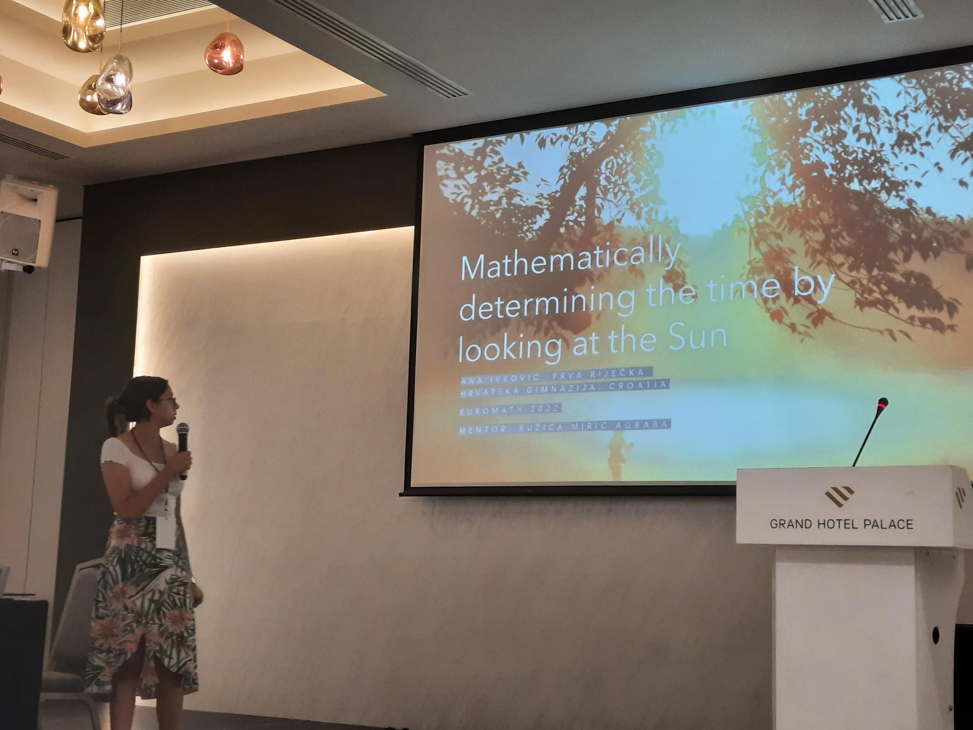 Učenica 3.b razreda Ana Ivković sa svojom temom “Mathematically determining the time by looking at the Sun“, Viktorija Kavain iz 3.d razreda s temom “Page to stage“, učenice 2.b Lana Acinger i Andrea Hasančević u paru su predstavile rad na temu “Mathematics in cooking” te njihov kolega iz razreda Jure Jerneić sa svojom prezentacijom “Analyzing and optimizing football strategies using mathematics” povezali su naučeno znanje matematike s raznim područjima svakodnevnog života. Učenici su zadovoljni svojim nastupom i stečenim iskustvom kao i okusom gyrosa, souvlakija i tzatzikija.